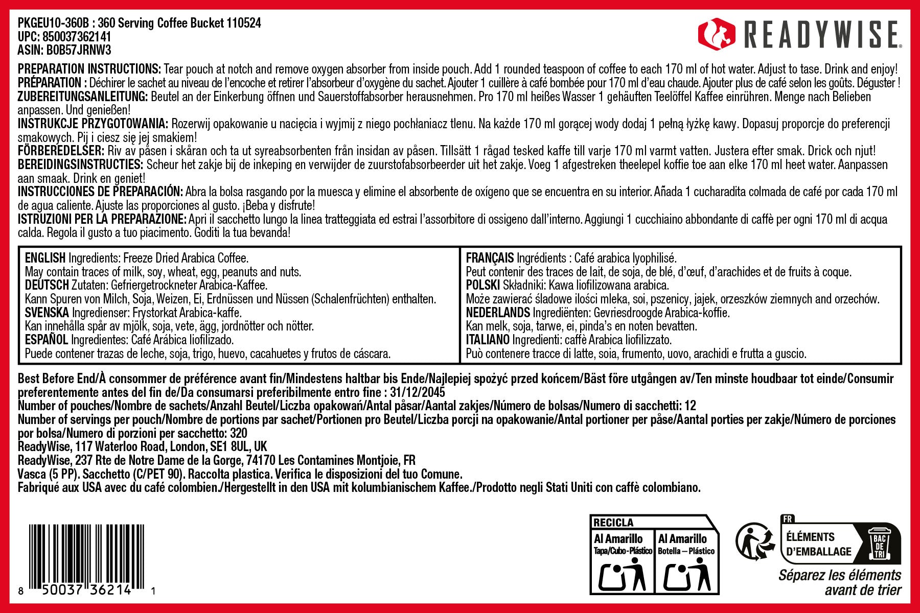 ReadyWise, 360 portions, seau à café, durée de conservation jusqu'à 15 ans