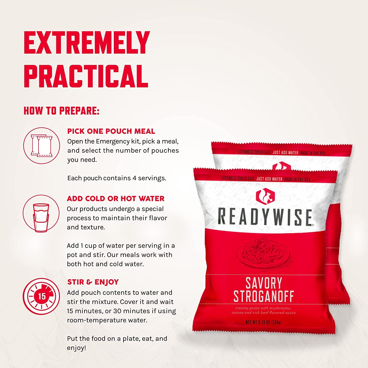 - AJOUTEZ DE L'EAU : chaque plat est facile à préparer dans n'importe quelle situation d'urgence, en utilisant simplement de l'eau.