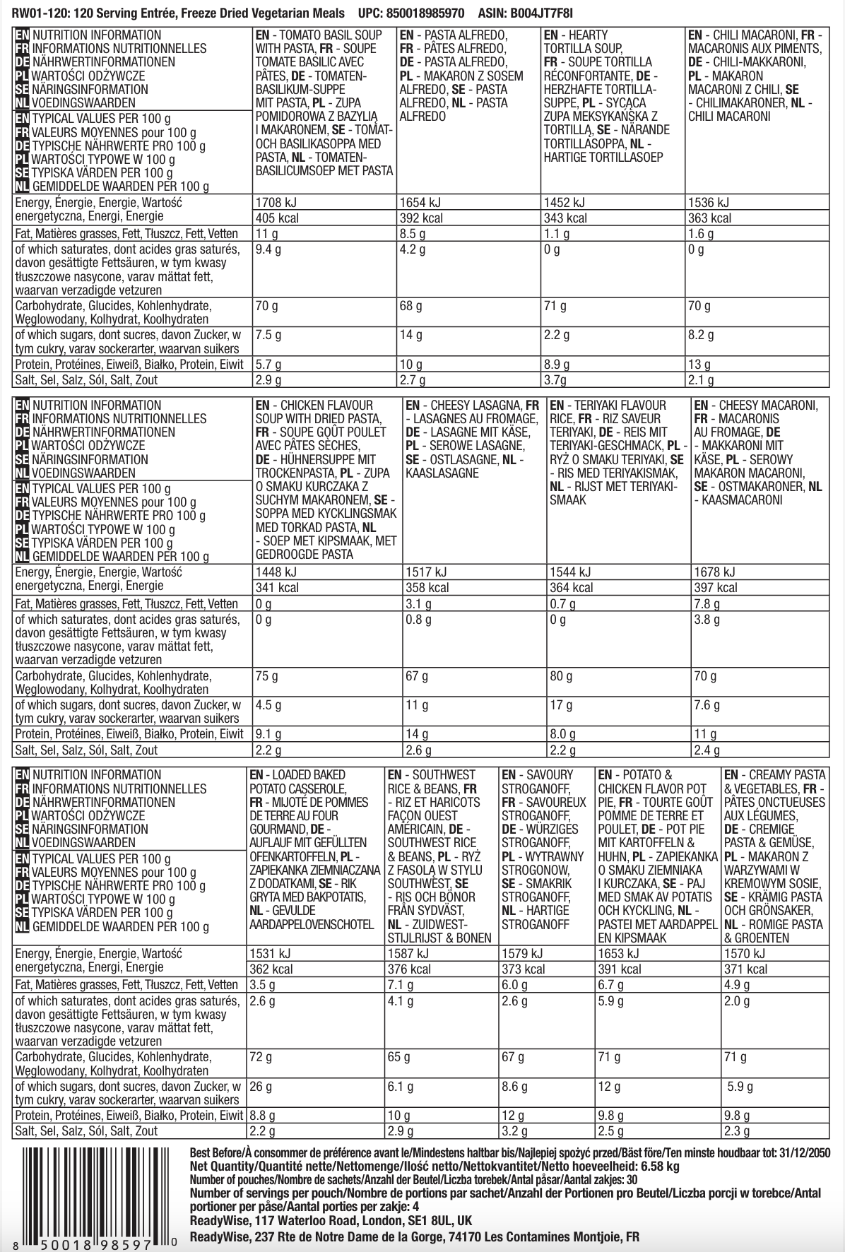 Entrée de 120 portions, repas végétariens lyophilisés, jusqu'à 25 ans