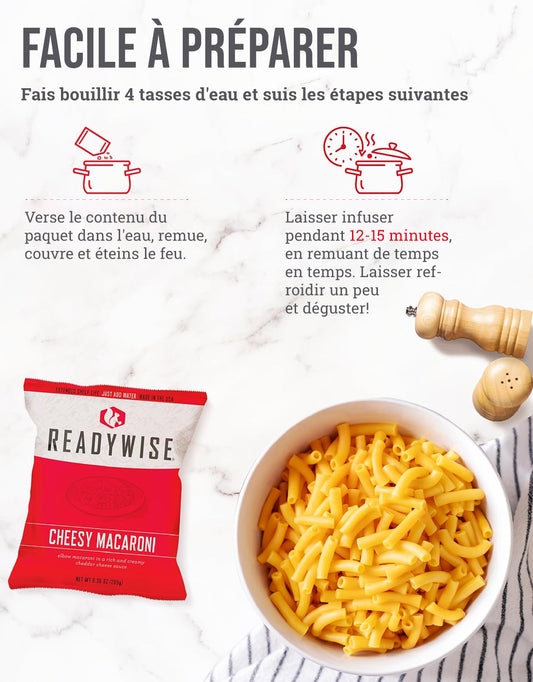 Je l'ai acheté pour me préparer à des situations d'urgence, mais j'ai essayé quelques paquets juste pour voir le goût ! Les macaronis au fromage étaient INCROYABLES et j'ai aussi apprécié les pâtes crémeuses. L'emballage est super, il se range bien dans mon garde-manger. Dans l'ensemble, c'est une bonne chose à avoir au cas où. J'en rachèterai certainement... j'envisage d'ajouter un seau de 120 repas !